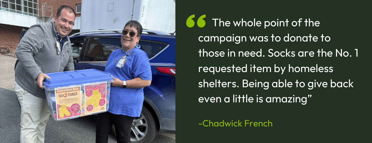 UVA Health University Medical Center in Charlottesville, VA, collected an extraordinary 42,000 pairs of socks, doubling last year’s total. Their 48 bins of socks were delivered to local shelter The Haven, and 47 bins went to the Salvation Army. Systems Operations Controller Chadwick French spoke with CBS 19 News about this achievement.