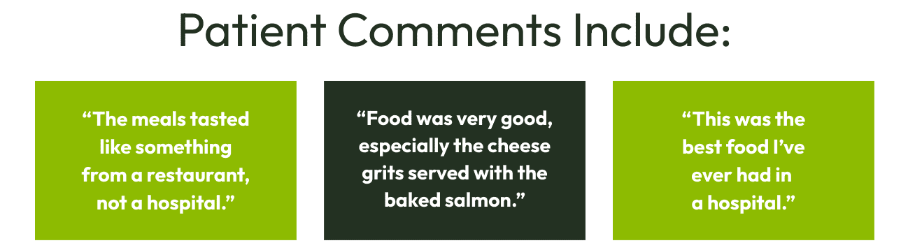 Since the launch of the new patient menu, feedback from both Press Ganey surveys and discharge calls has been overwhelmingly positive. Compared to prior results, onsite teams are now receiving significantly more direct comments from patients—many of which specifically highlight the variety, freshness, and restaurant-quality feel of the meals. Patients have expressed appreciation not only for the quality of the food but also for the improved dining experience as a whole. The new menu has appealed to a wide range of patient preferences, creating moments of comfort and satisfaction during hospital stays.