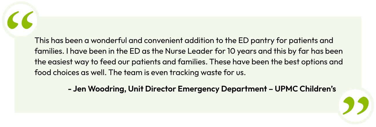 The Emergency Department will continue to serve as health care’s front door as ambulatory access challenges and poor chronic disease management are prevalent. The growth of high-acuity emergent visits creates a more complex ED patient mix, leading to longer lengths of stay, heightened demand for specialist care and surgical services, and increased IP admissions. The ED Impact Project initiative meets these patients and our clinical caregivers where they are, with quality and accessible food options that help promote healing in a fast-paced environment.
