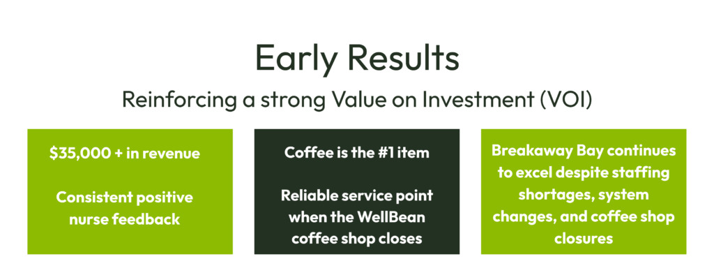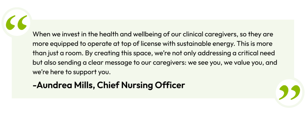 Breakaway Bay is an intentional, restorative space designed to help nurses refuel, recharge, and stay focused on patient care. It offers healthy snacks a comfortable place to rest, and convenient refreshments aligned with nursing schedules.